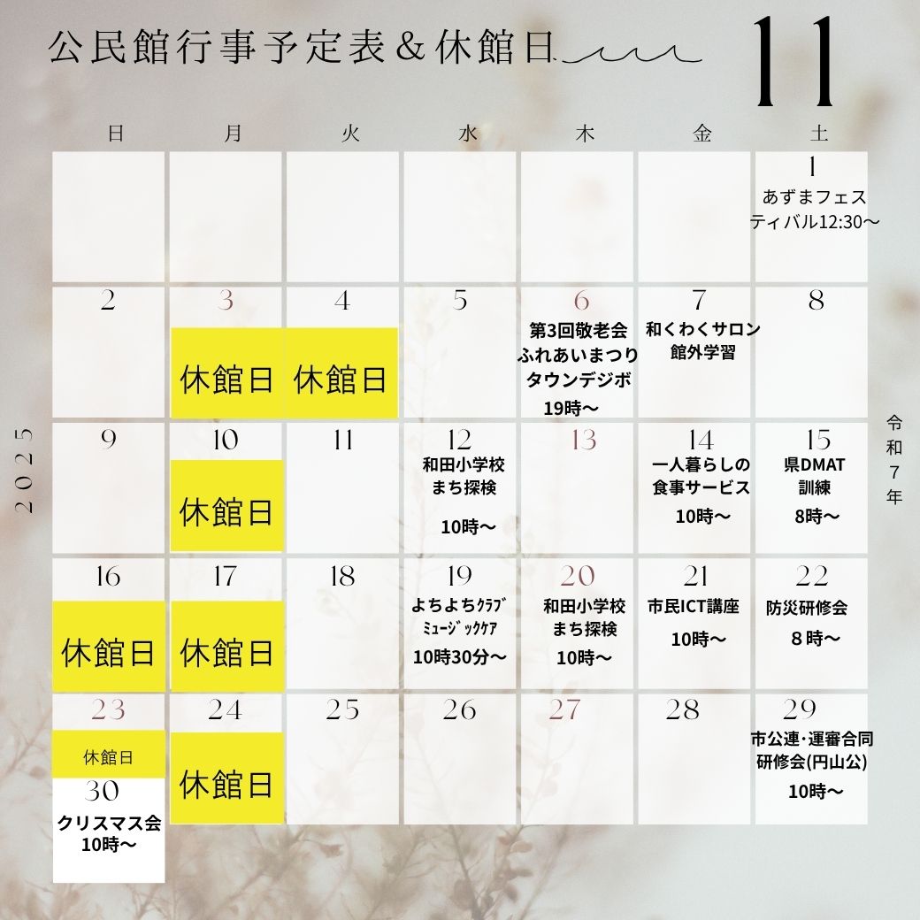 令和7年11月の行事予定と休館日情報を掲載