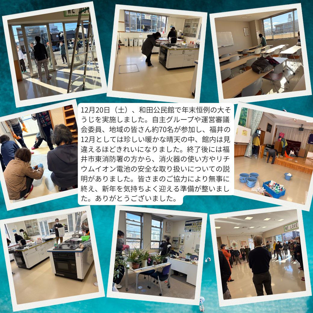 12月20日(土)、和田公民館にて年末恒例の大そうじを行いました。自主グループや運営審議会委員の方、個人の方など約70名の方に参加いただきました。20日の天気は、福井の12月には珍しい暖かな晴天となり絶好のそうじ日和、皆様のご協力のおかげで作業も進み館内はピカピカになりました。大そうじ終了後は福井市東消防署から消火器の使い方やスマホなどに使われているリチウムイオン電池の取り扱いなどをお話していただきました。皆様のご協力のおかげで無事終了。おかげさまで気持ちよく新年を迎える準備が整いました。ありがとうございました。