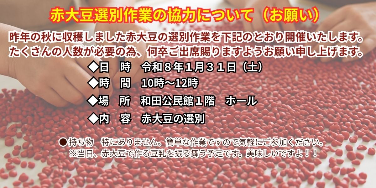 ホーム お知らせ 一人でも来てくださると嬉しいです!赤大豆選別作業の協力について(お願い) 一人でも来てくださると嬉しいです!赤大豆選別作業の協力について(お願い) 日付:2026.01.23 カテゴリー: お知らせ こんな事やったよ